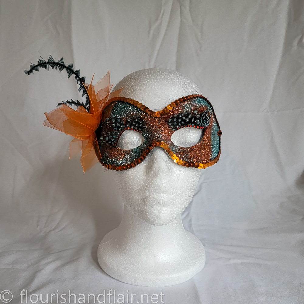This orange and blue half mask features vibrant colors, elegant feathers, and decorative ribbon. Designed as one size fits all, it's perfect for adding a touch of flair to any costume or event.