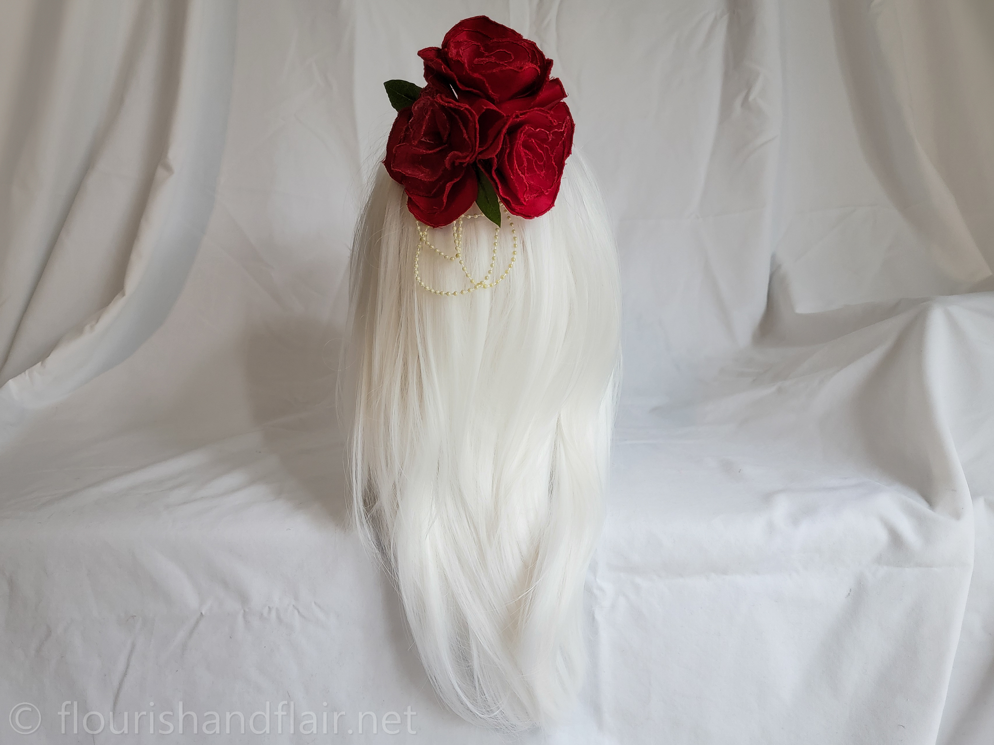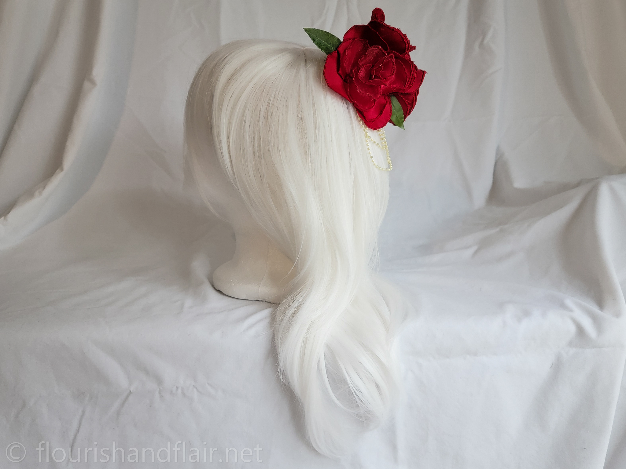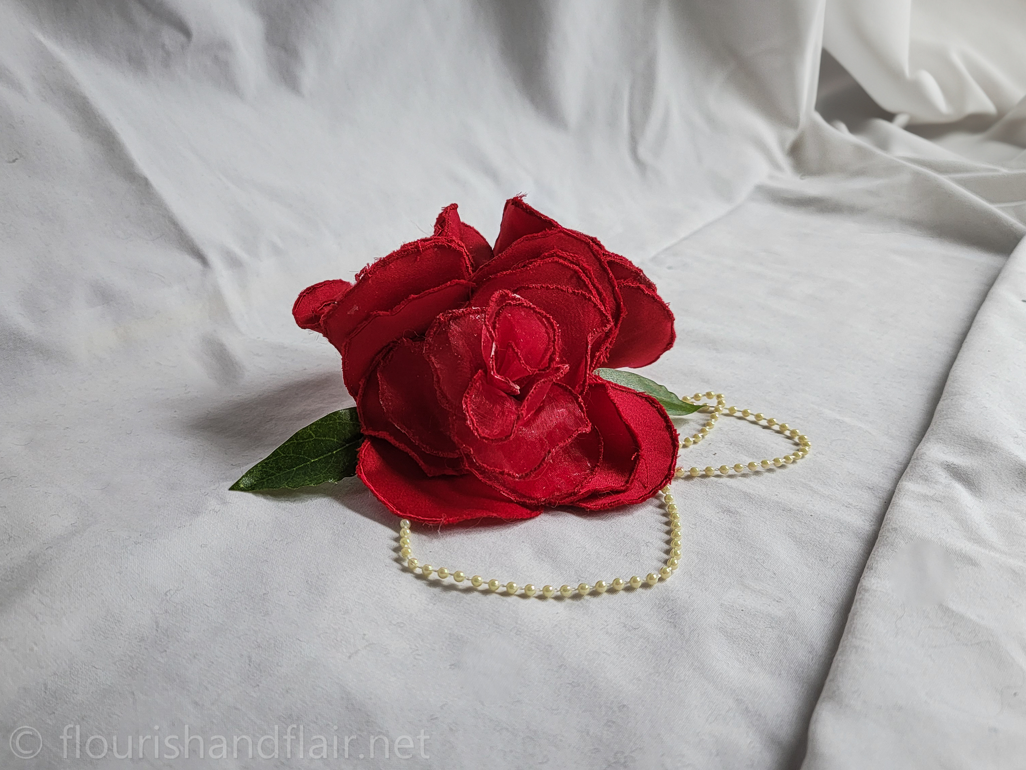 This embroidered rose hair clip features delicate satin outer petals, chiffon inner petals, and gold pearl accents for a dainty, handcrafted touch. A versatile accessory perfect for elevating any hairstyle with timeless elegance.