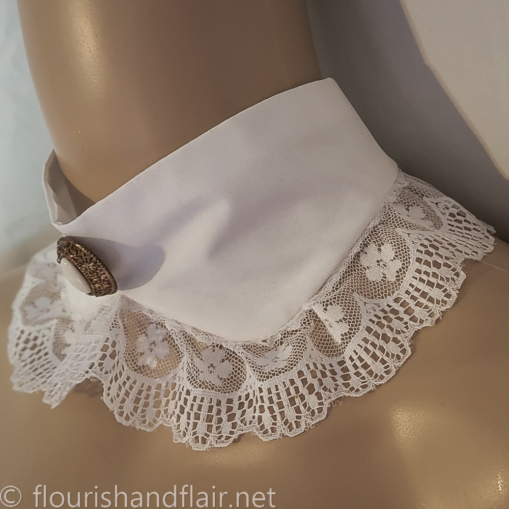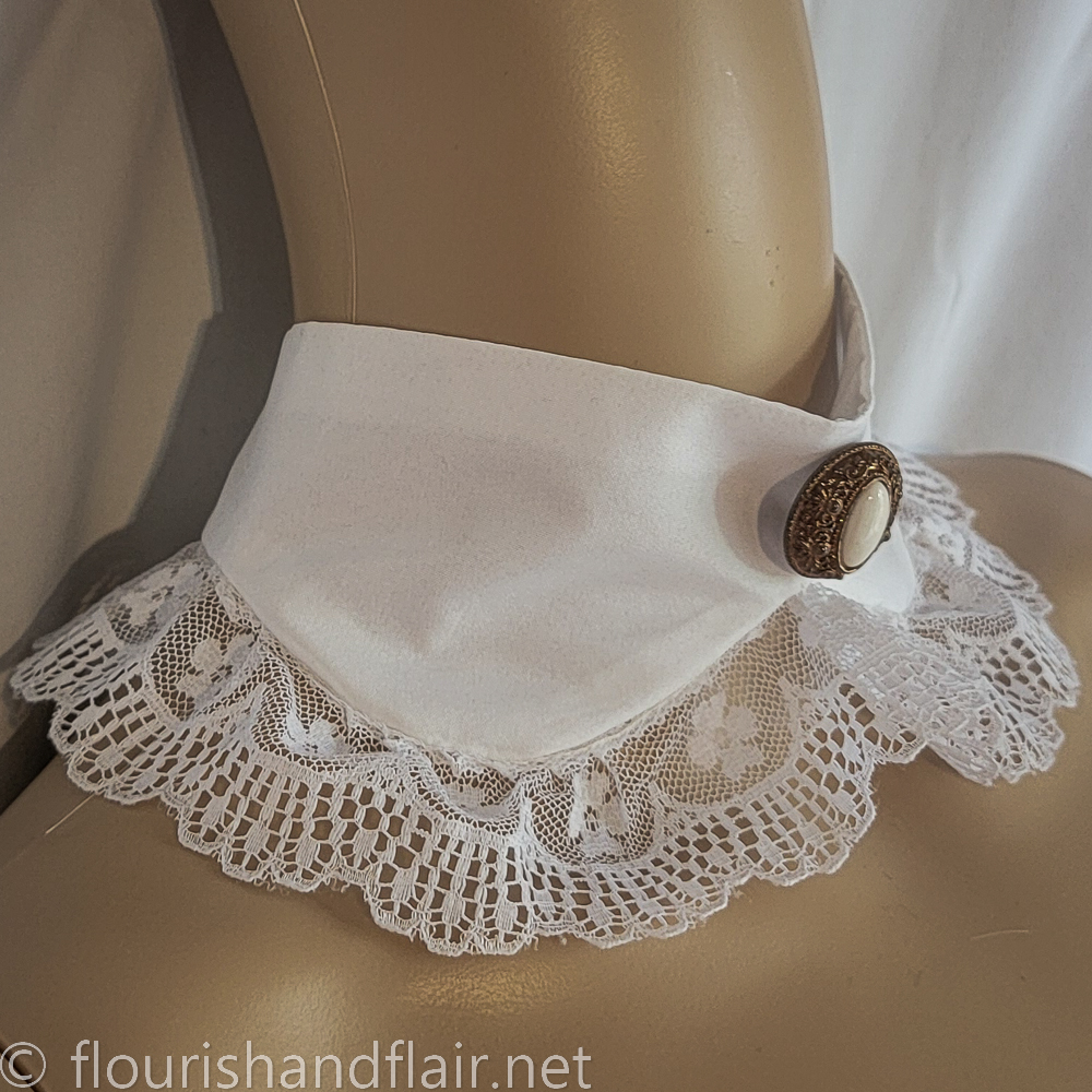 Add an elegant flourish to any outfit or costume with this lacy Victorian-style collar! Made of soft poly "silk" with upcycled lace trim and button accent, this collar features a Velcro back closure for adjustability. Comfortably fits neck sizes from 15" to 18" maximum.