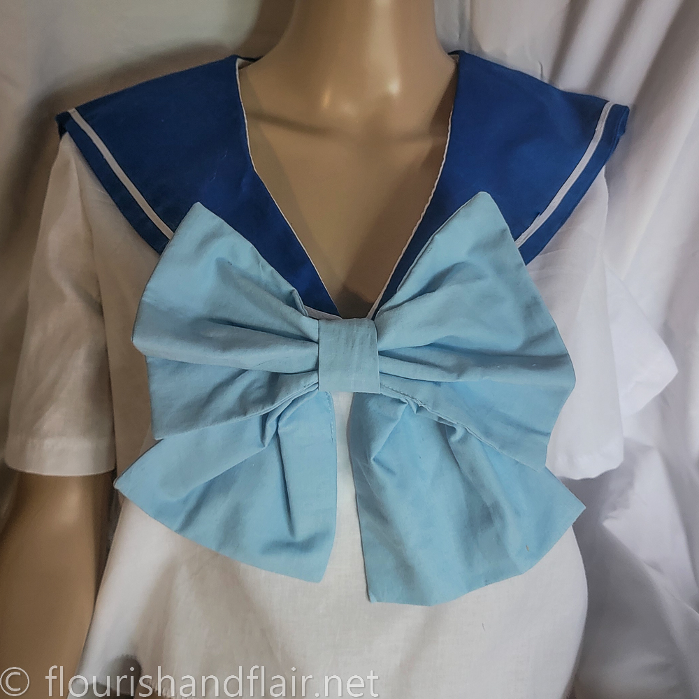 Finish off any school uniform, serafuku, or outfit with a pin-on blouse bow. All colors 100% cotton, prewashed, allergen-free, with featherweight interfacing for stiffness. Bow is sewn onto a standard brooch pin for easy removal before washing. Deluxe bow features a secondary "ribbon end" that drapes down in addition to the pleated top bow. Full bow measures 12.5" across x 10" top to bottom.