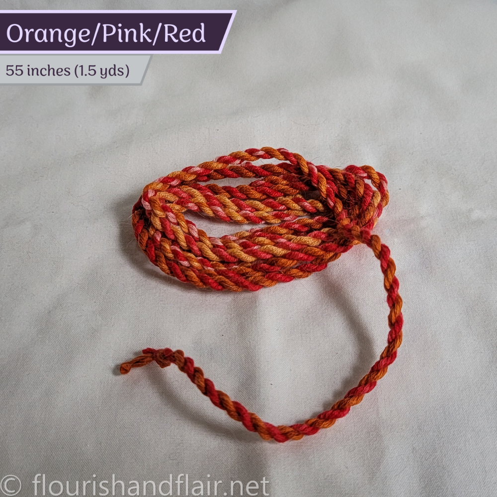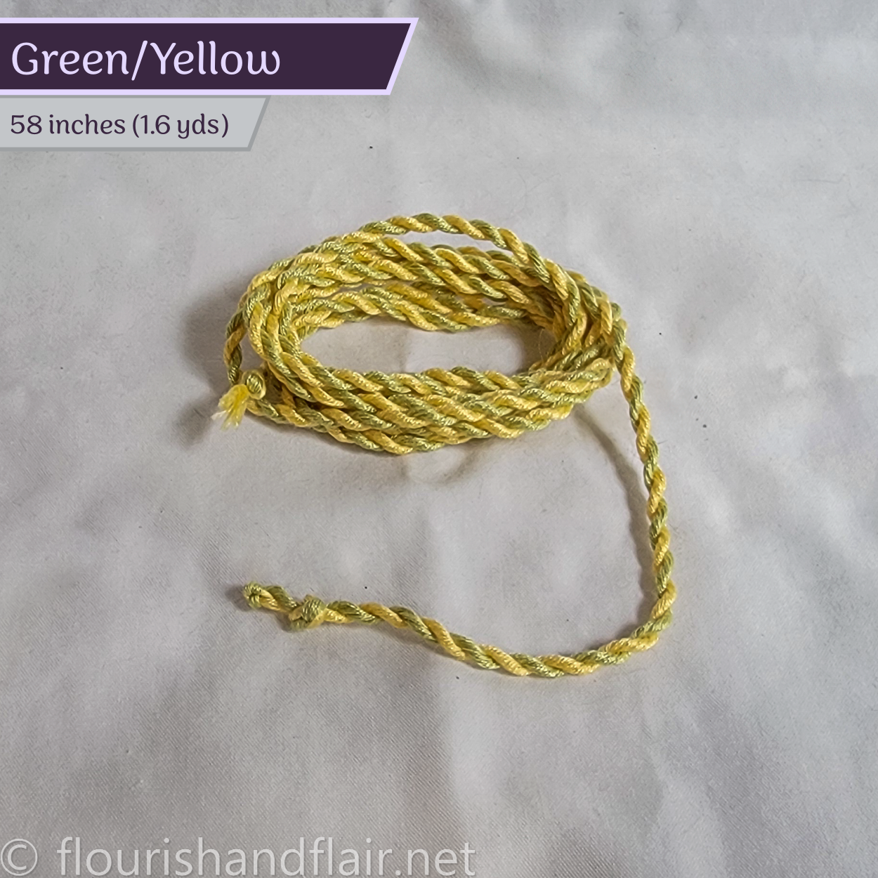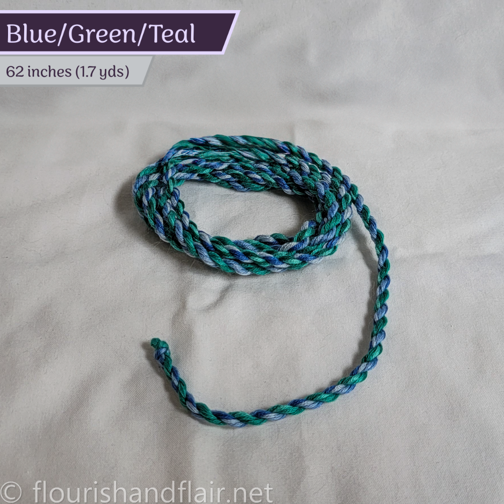 Each length of cord is hand twisted using at least two fiber colors. Lengths vary by color. This cord is strong enough to lace a corset, and thin enough to lace through medium to large beads.