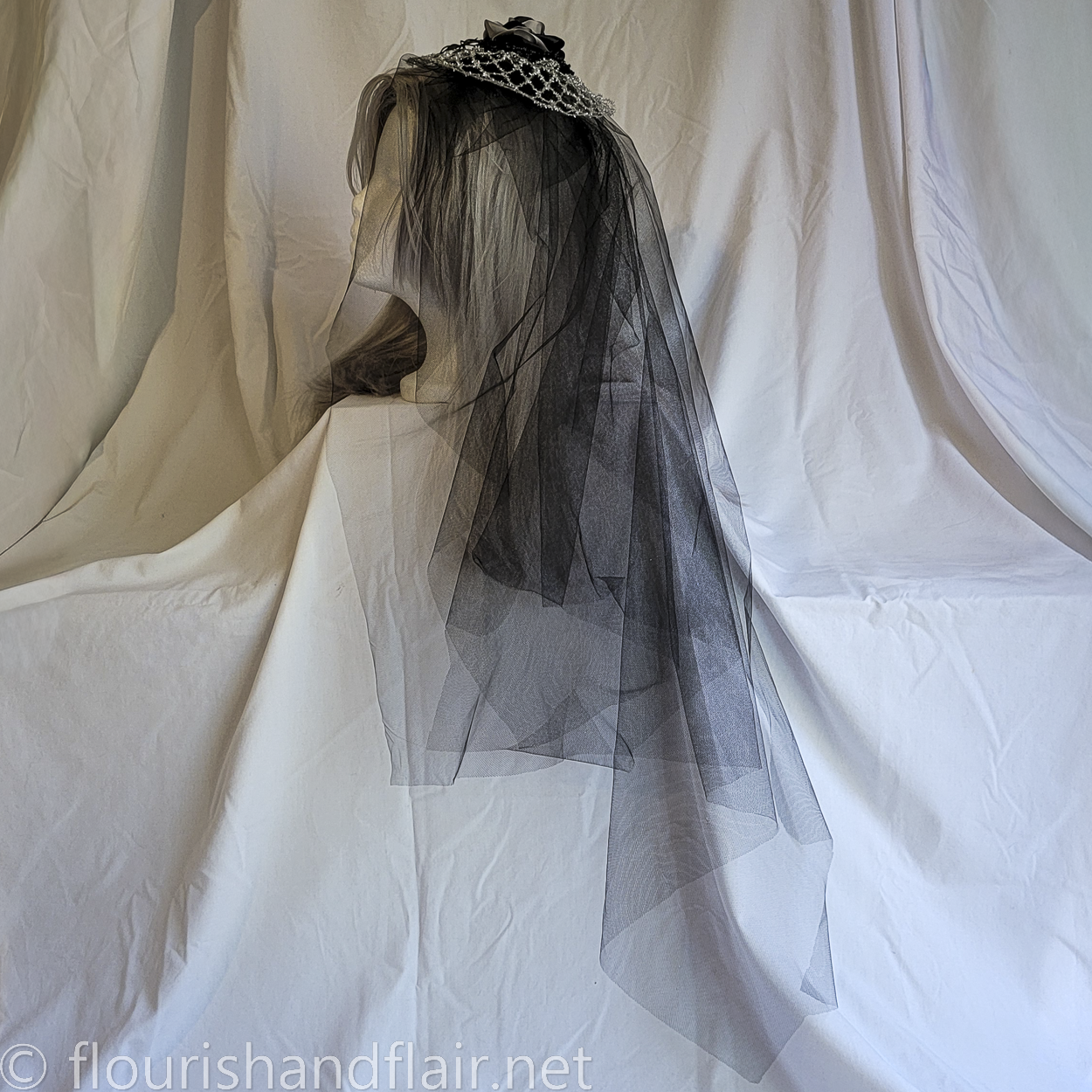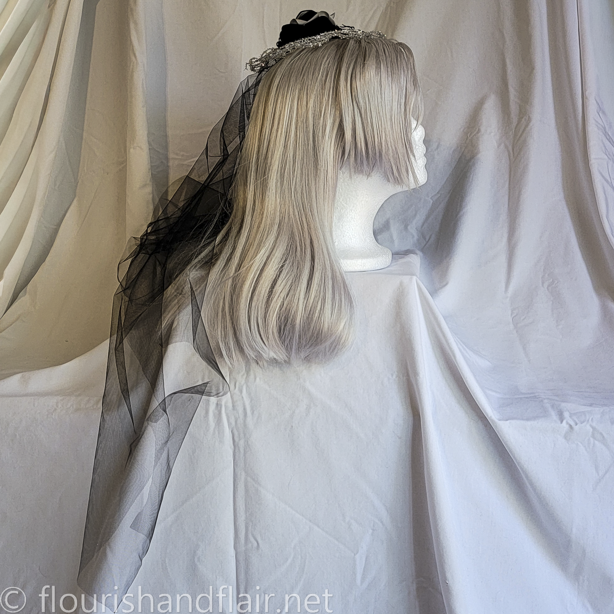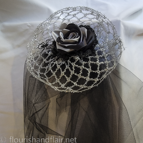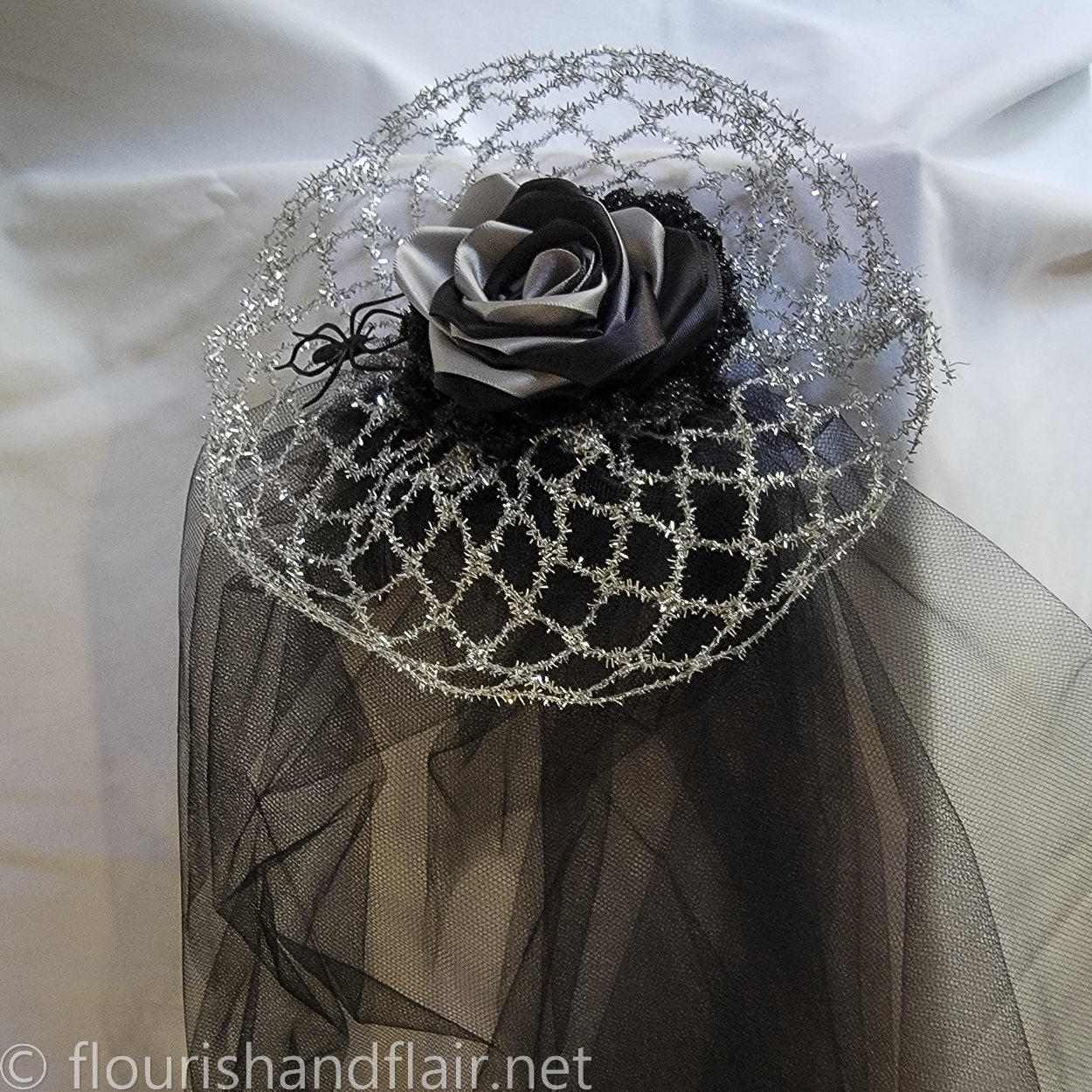 An excellent flourish to top off a Halloween costume, or just wear for the holiday and make Halloween fun. One of our special deluxe ribbon roses is mounted onto a base formed by silvery glitter spiderweb ribbon, with a trailing veil of tattered black tulle. Includes three clip-on plastic spiders to position however you like it, or remove.
