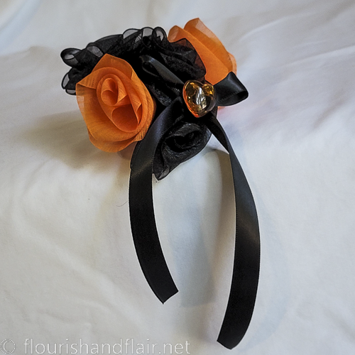 Just in time for Halloween, good for costumes or every-day wear. Hand-made roses and bows are sewn onto a ribbon base and accented with an orange heart cabochon, mounted on a snap-type hair barrette to slide into any hairstyle. One of a kind accessory, due to the arrangement of roses and materials used.