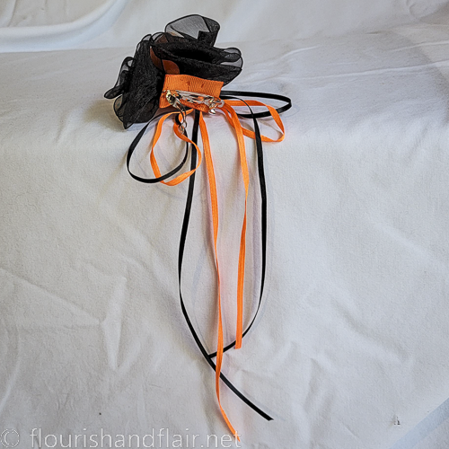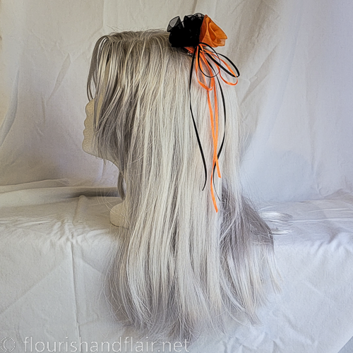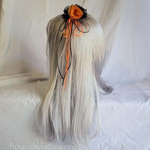Happy Halloween! A fun little hair barrette to quick snap into any 'do to make every day Halloween. Delicate sheer roses in orange chiffon and black organza are clustered on a ribbon base with trailing black and orange satin ribbons to add a touch of flair. Silver snap-type barrette is sewn, not glued, onto the base for long-lasting security.