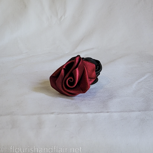 A red satin rose surrounded by smaller black roses. A simple yet elegant hair accessory. Easy to incorporate into your style with a no-metal elastic band.