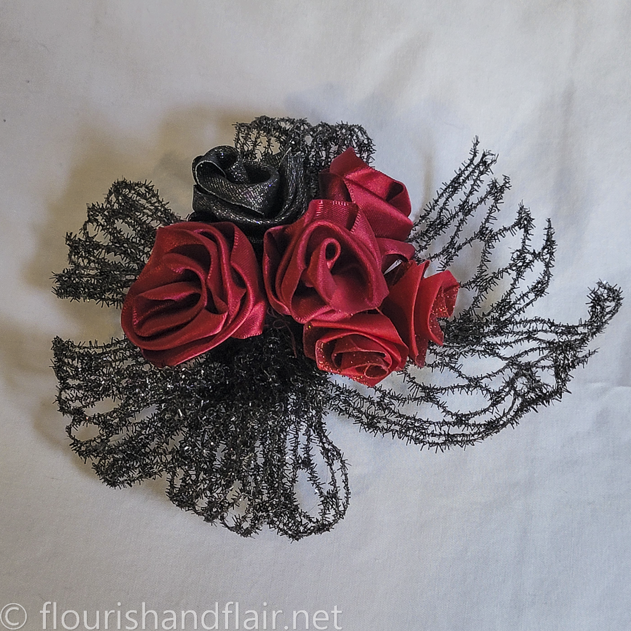 From the roses to the sparkling lace, this hair clip will add a classy flourish to elegant outfits and formal costumes. All roses have been made by hand in studio, and are clustered together on a base made from sparkling black net ribbon, matching the single black sparkle rose nestled in a cluster of maroon-red roses. Everything is hand-sewn together to hold shape and hand-sewn to a felt base, as well as the silver clip-style hair barrette. The wired sparkle tails can be moved and posed, even spread out wider. This is a unique item, due to the availability of materials. Once it’s gone, there will never be another!