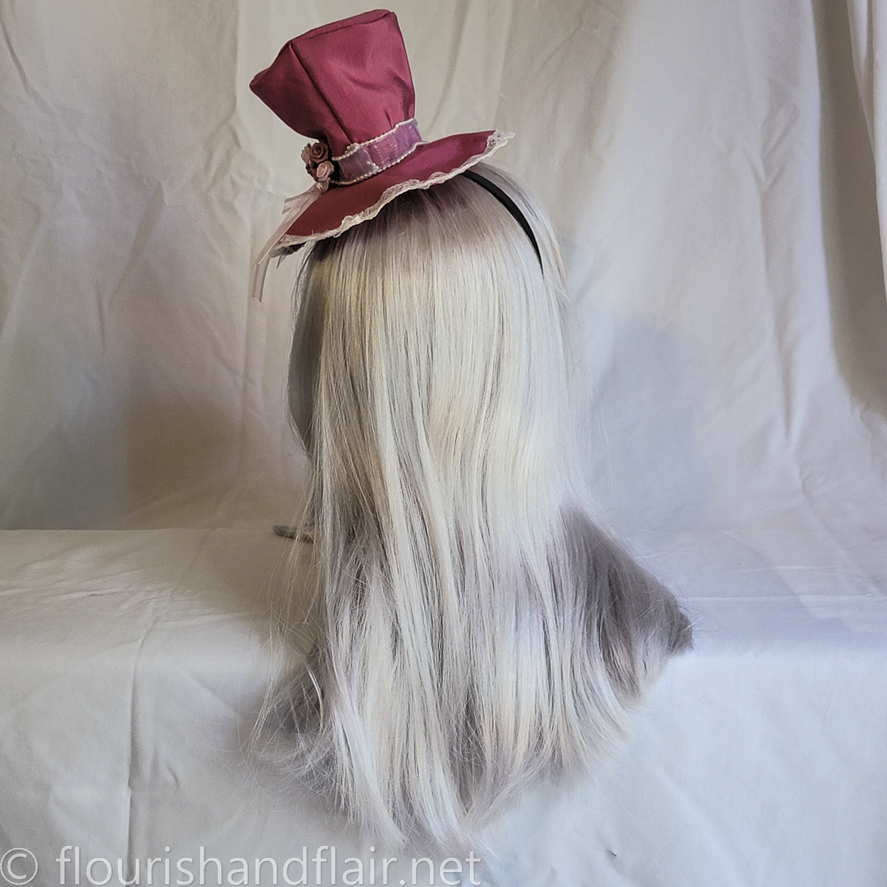 A cute accessory to top off a costume or fancy outfit! Adorable pink top hat is made from a unique textured poly fabric with lace double-faced brim edge, hat band made from bead-edged organza ribbon, and flourished with pink roses and pale pink ribbon bow. All accents upcycled out of a stash as the final, only pieces of that material, which makes this a truly unique, one-of-a-kind hat. Once it's gone, there will never be another like it!